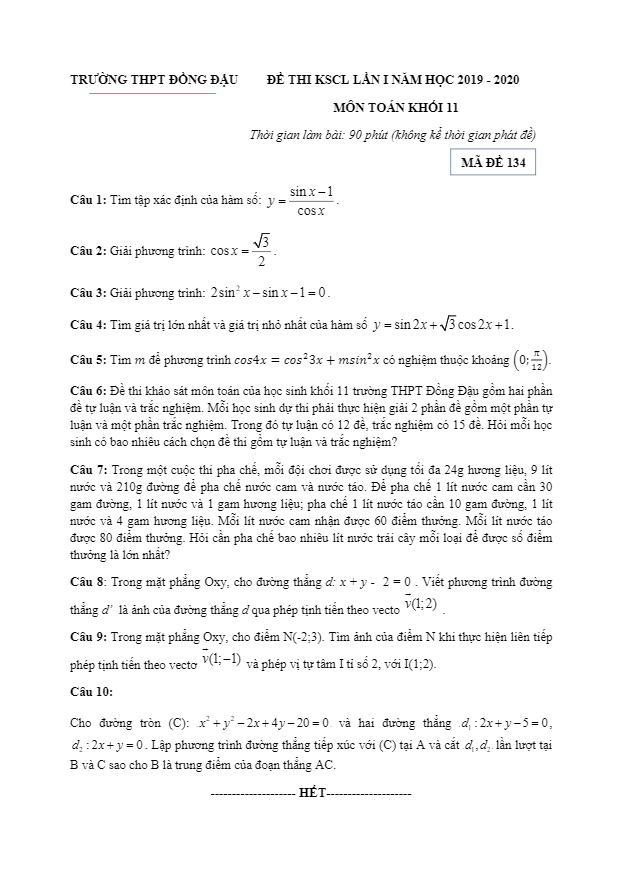 Đề KSCL Toán 11 lần 1 năm 2019 – 2020 trường THPT Đồng Đậu – Vĩnh Phúc