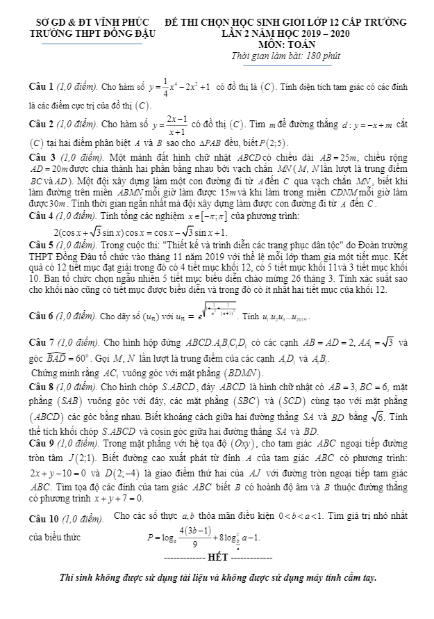 Đề thi HSG Toán 12 lần 2 năm 2019 – 2020 trường THPT Đồng Đậu – Vĩnh Phúc