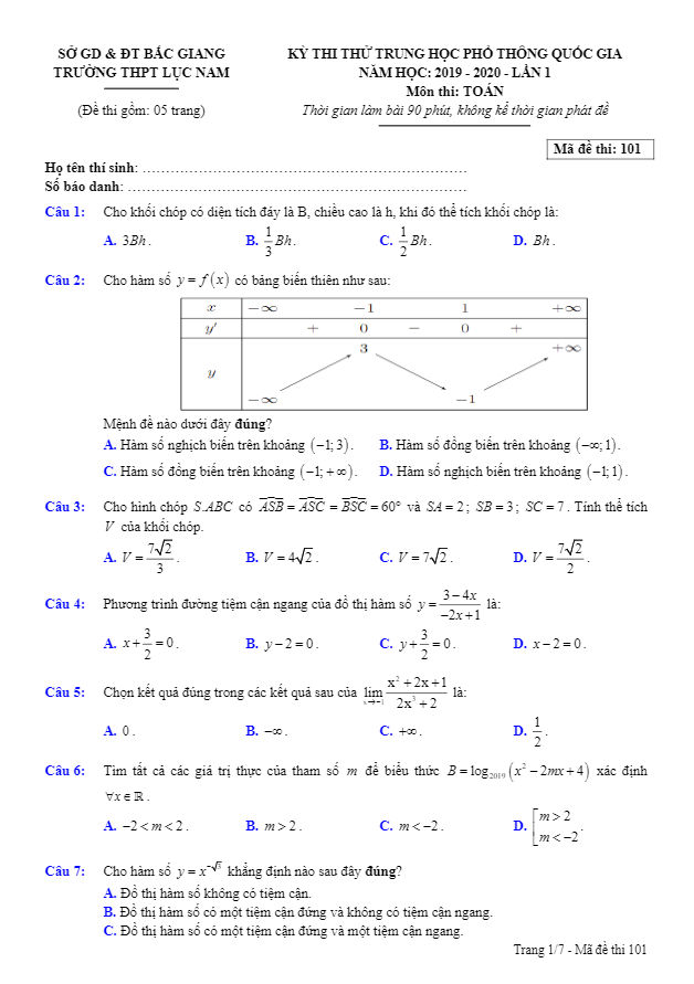 Đề thi thử THPT Quốc gia 2020 môn Toán lần 1 trường Lục Nam – Bắc Giang