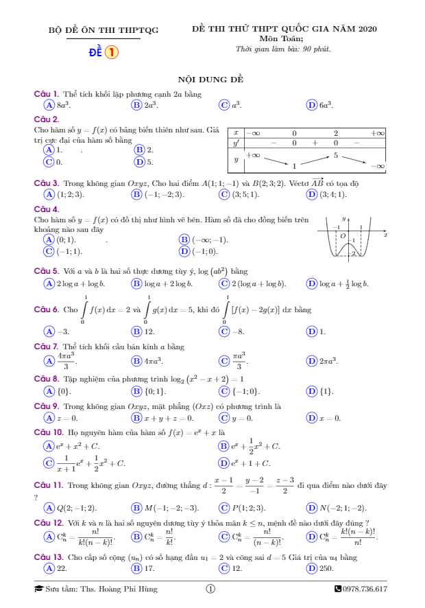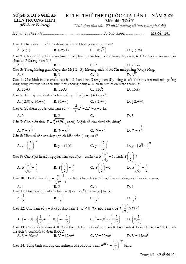 Đề Thi Thử THPT Môn Toán Đề thi thử THPT Quốc gia 2020 môn Toán lần 1 liên trường THPT – Nghệ An 18/01/2020