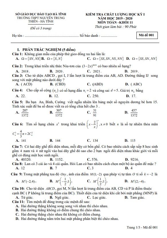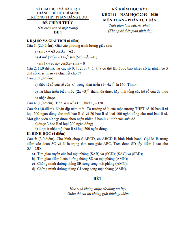 Đề Thi HK1 Toán 11 Đề thi cuối học kì 1 Toán 11 năm 2019 – 2020 trường THPT Phan Đăng Lưu – TP HCM 21/01/2020