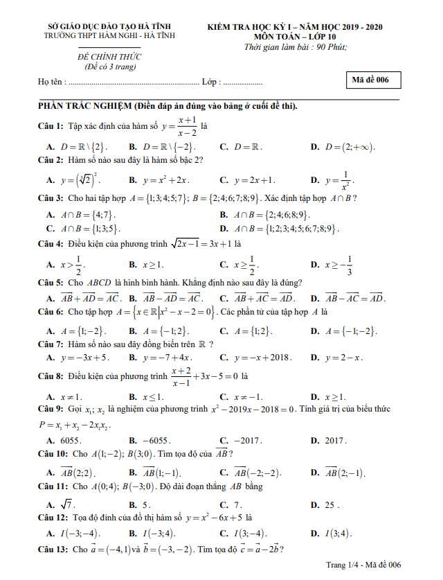 Đề Thi HK1 Toán 10 Đề học kì 1 Toán 10 năm 2019 – 2020 trường THPT chuyên Vị Thanh – Hậu Giang 17/01/2020