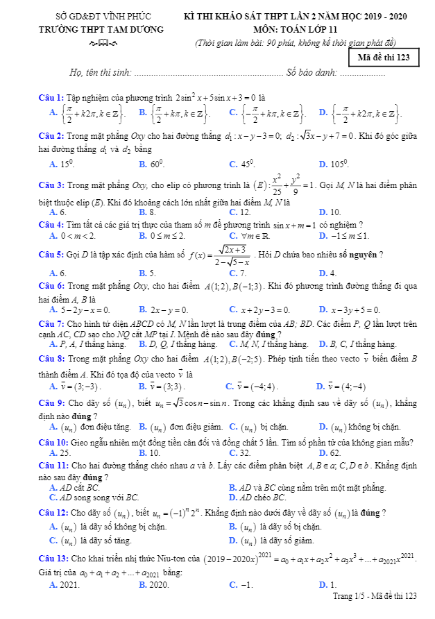 Khảo Sát Chất Lượng Toán 11 Đề khảo sát Toán 11 lần 2 năm 2019 – 2020 trường Tam Dương – Vĩnh Phúc 16/01/2020