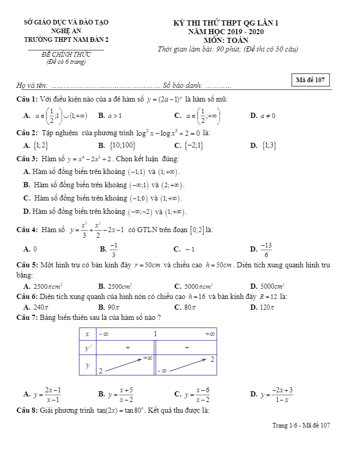 Đề Thi Thử THPT Môn Toán Đề thi thử THPT QG 2020 môn Toán lần 1 trường THPT Nam Đàn 2 – Nghệ An 16/01/2020