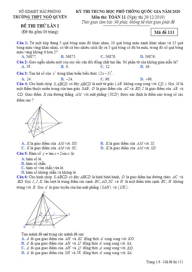Khảo Sát Chất Lượng Toán 11 Đề thi thử Toán 11 THPT Quốc gia 2020 lần 1 trường Ngô Quyền – Hải Phòng 16/01/2020