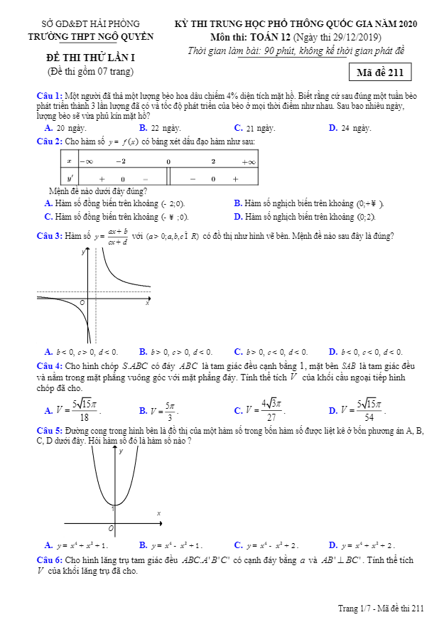 Đề Thi Thử THPT Môn Toán Đề thi thử Toán THPT Quốc gia 2020 lần 1 trường Ngô Quyền – Hải Phòng 16/01/2020