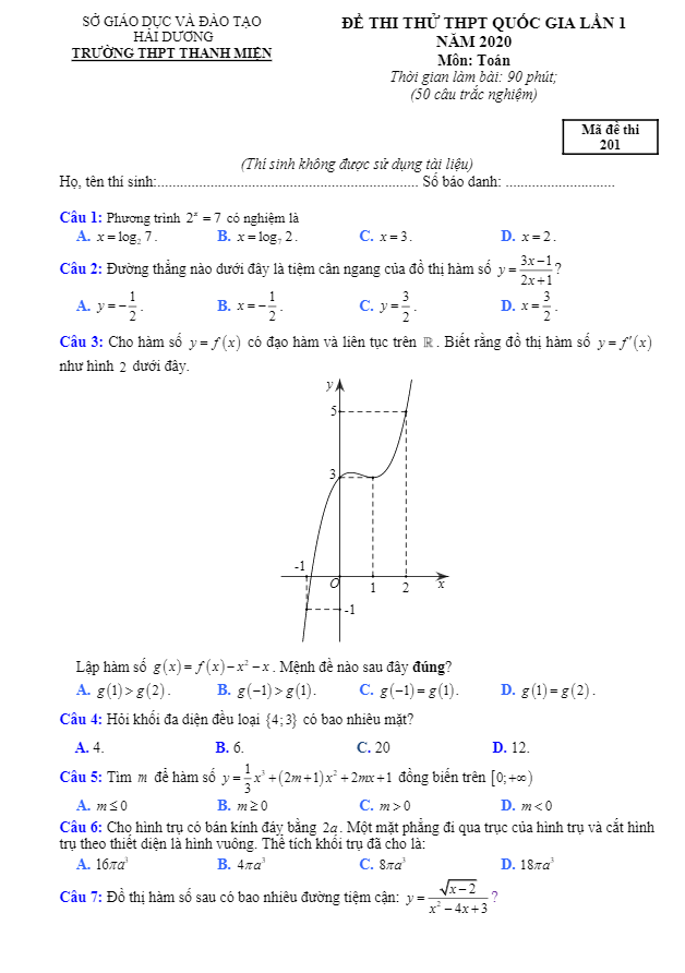 Đề Thi Thử THPT Môn Toán Đề thi thử Toán THPT Quốc gia 2020 lần 1 trường Thanh Miện – Hải Dương 16/01/2020