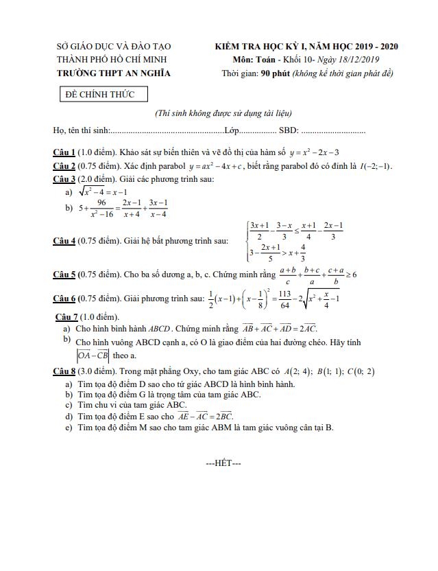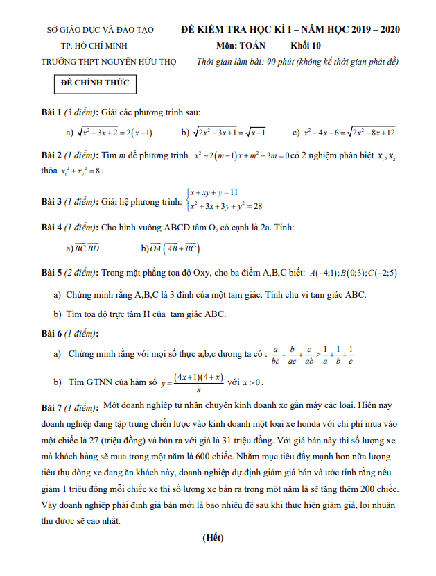Đề Thi HK1 Toán 10 Đề thi học kì 1 Toán 10 năm 2019 – 2020 trường THPT Nguyễn Hữu Thọ – TP HCM 15/01/2020