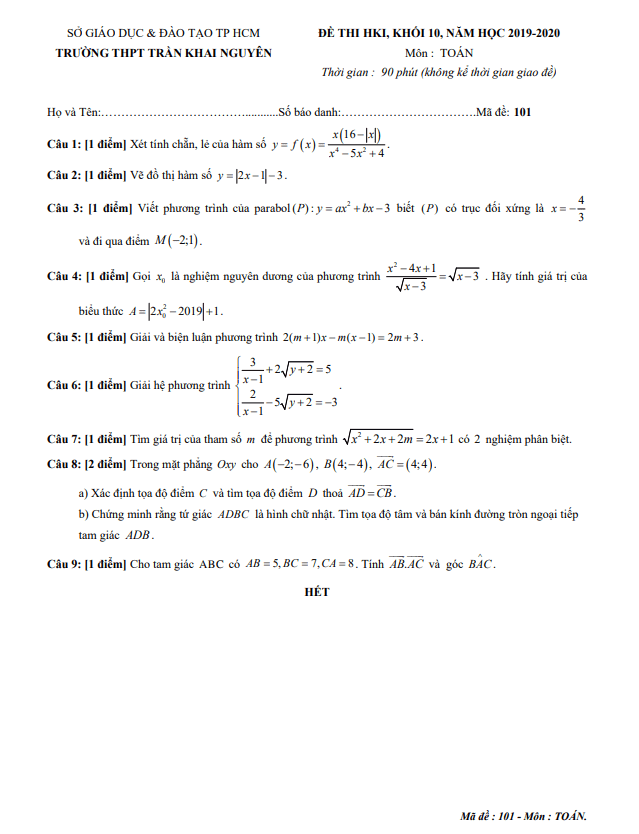 Đề Thi HK1 Toán 10 Đề thi học kì 1 Toán 10 năm 2019 – 2020 trường THPT Trần Khai Nguyên – TP HCM 15/01/2020