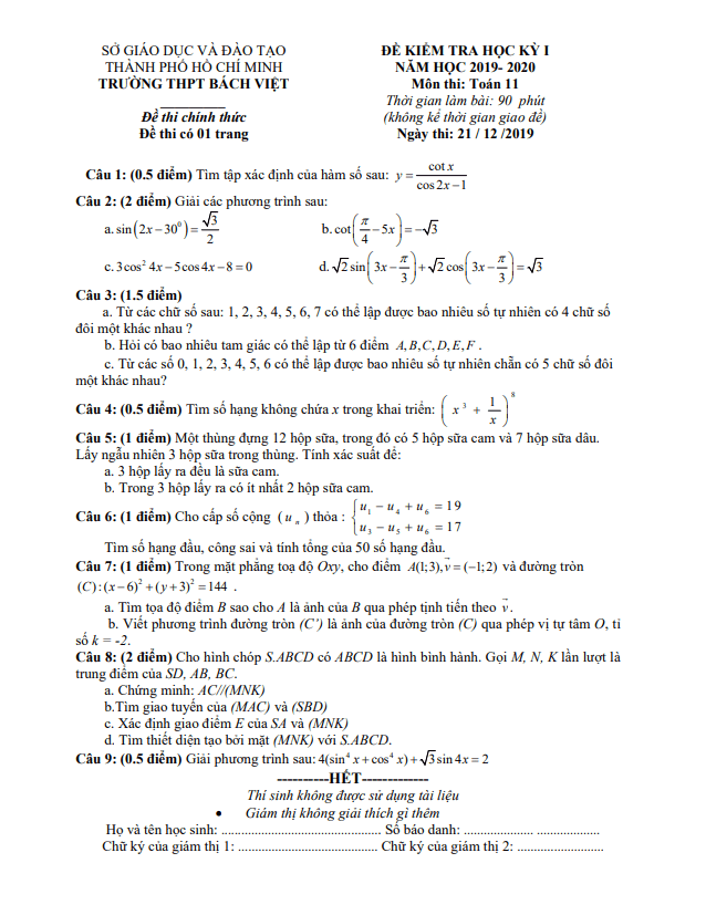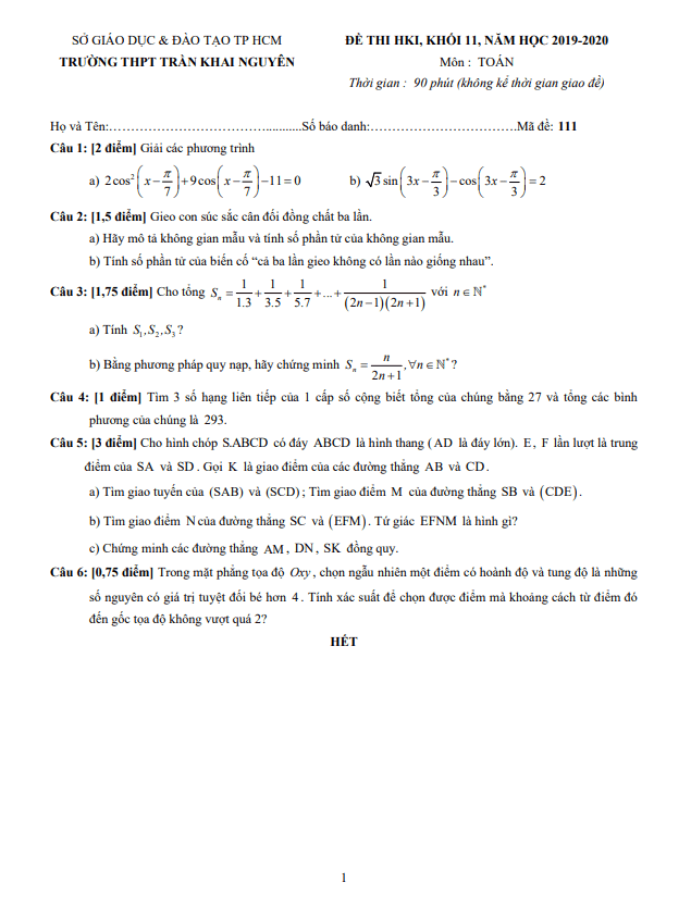 Đề Thi HK1 Toán 11 Đề thi học kì 1 Toán 11 năm 2019 – 2020 trường THPT Trần Khai Nguyên – TP HCM 15/01/2020
