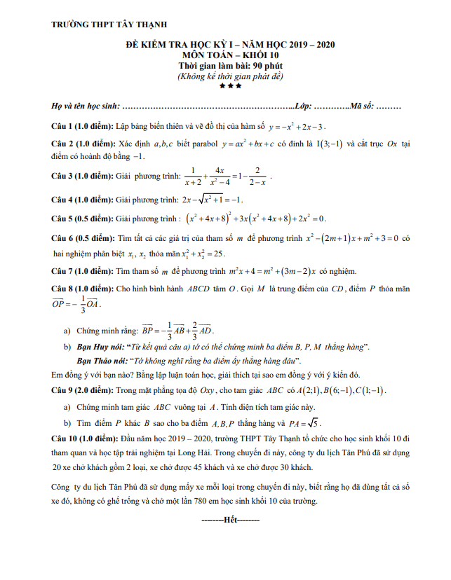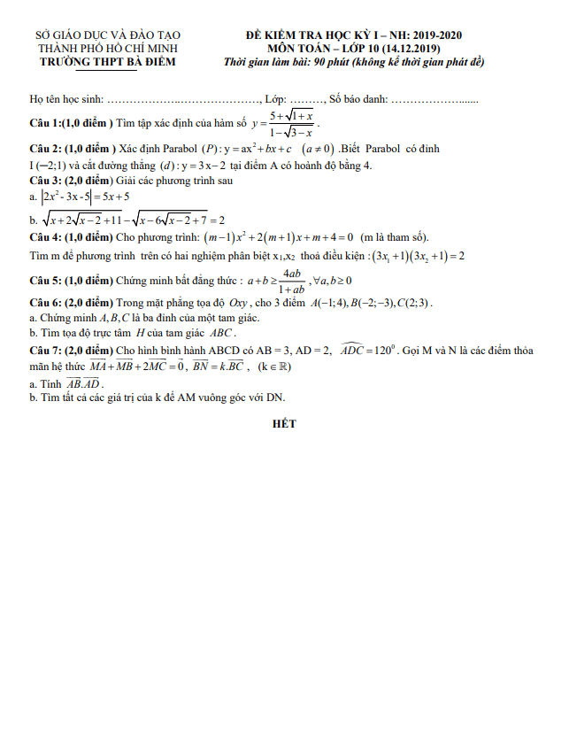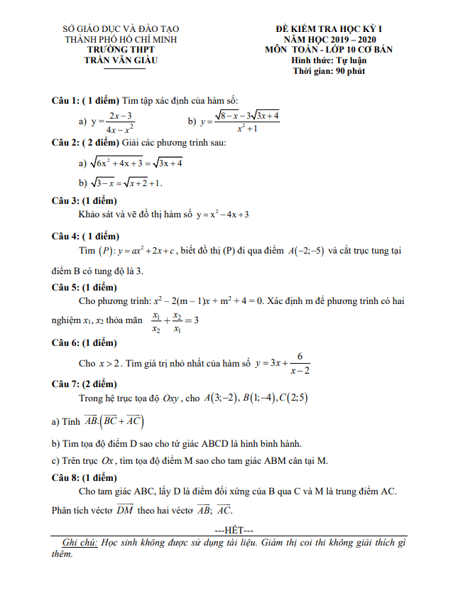 Đề Thi HK1 Toán 10 Đề thi học kì 1 Toán 10 năm 2019 – 2020 trường THPT Trần Văn Giàu – TP HCM 15/01/2020
