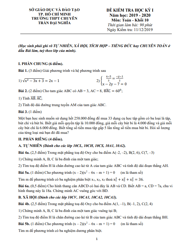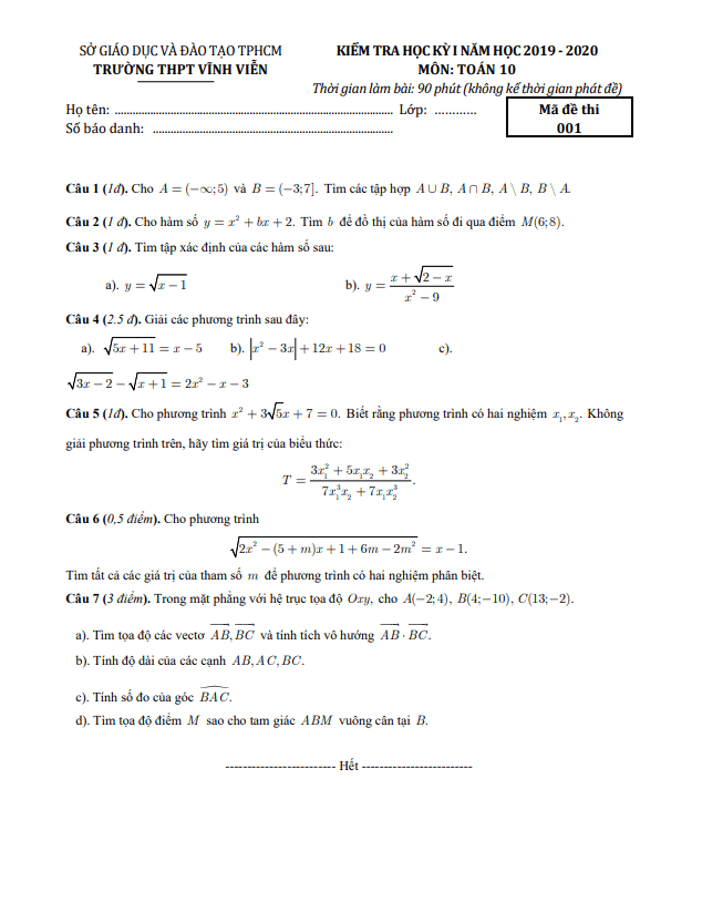 Đề Thi HK1 Toán 10 Đề thi học kì 1 Toán 10 năm 2019 – 2020 trường THPT chuyên Trần Đại Nghĩa – TP HCM 15/01/2020