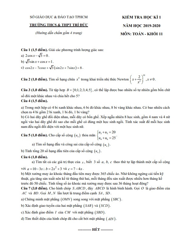 Đề Thi HK1 Toán 11 Đề thi học kì 1 Toán 11 năm 2019 – 2020 trường THCS&THPT Trí Đức – TP HCM 15/01/2020