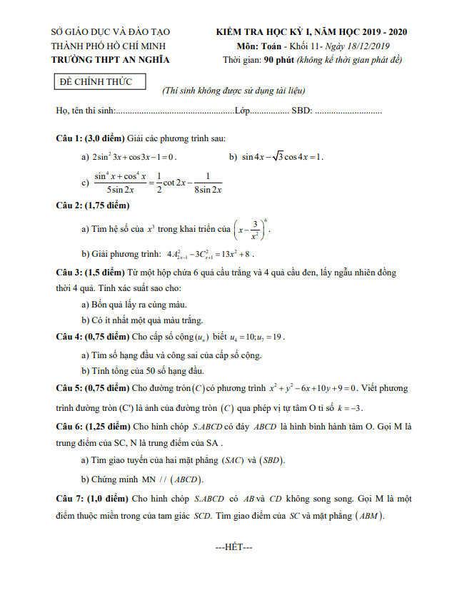 Đề Thi HK1 Toán 11 Đề thi học kì 1 Toán 11 năm 2019 – 2020 trường THPT chuyên Trần Đại Nghĩa – TP HCM 15/01/2020