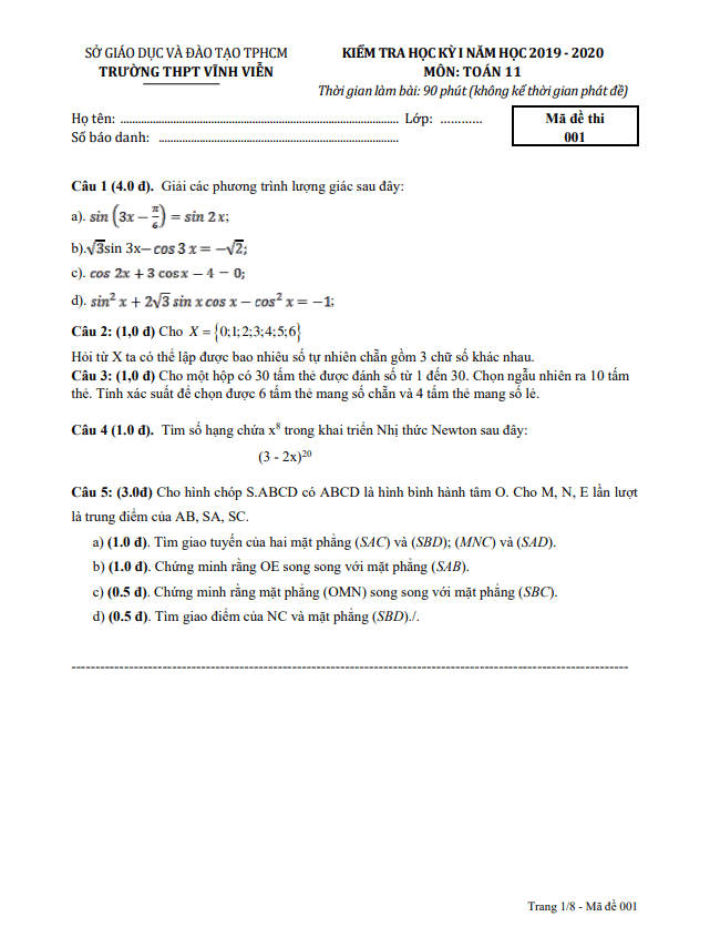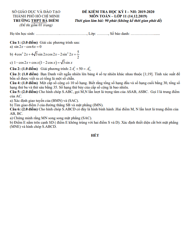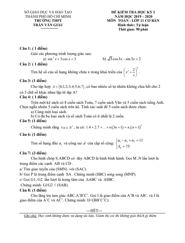 Đề Thi HK1 Toán 11 Đề thi học kì 1 Toán 11 năm 2019 – 2020 trường THPT Trần Văn Giàu – TP HCM 15/01/2020