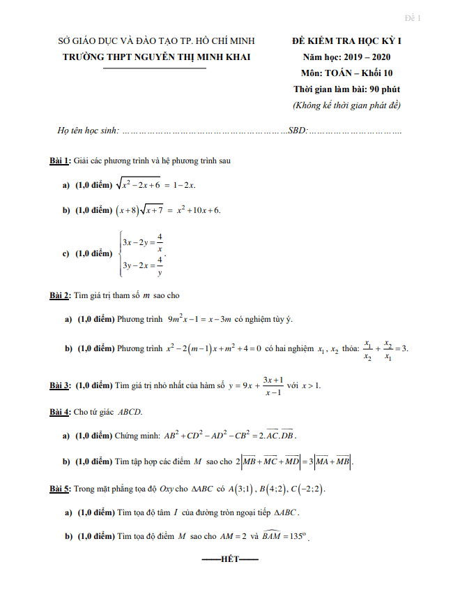 Đề Thi HK1 Toán 10 Đề thi HK1 Toán 10 năm 2019 – 2020 trường THPT Nguyễn Thị Minh Khai – TP HCM 14/01/2020