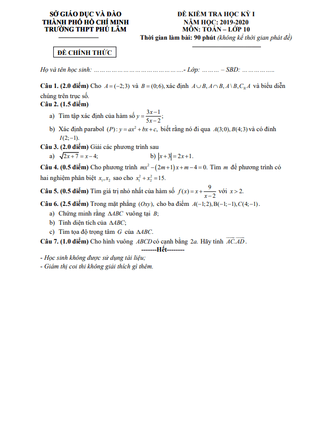 Đề Thi HK1 Toán 10 Đề thi học kì 1 Toán 10 năm 2019 – 2020 trường THPT Bùi Thị Xuân – TP HCM 15/01/2020