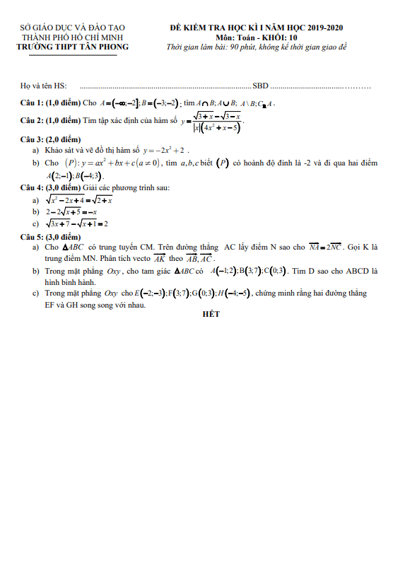 Đề Thi HK1 Toán 10 Đề thi học kì 1 Toán 10 năm 2019 – 2020 trường THPT Hàn Thuyên – TP HCM 15/01/2020