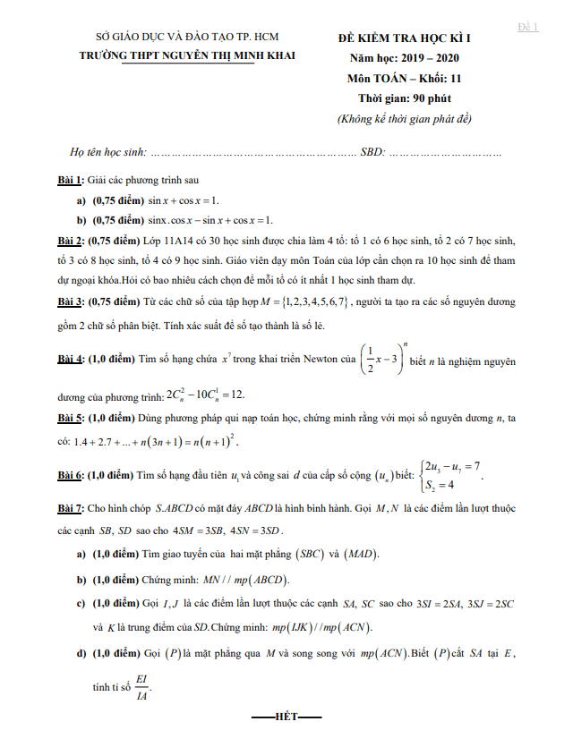 Đề Thi HK1 Toán 11 Đề thi HK1 Toán 11 năm 2019 – 2020 trường THPT Nguyễn Thị Minh Khai – TP HCM 14/01/2020