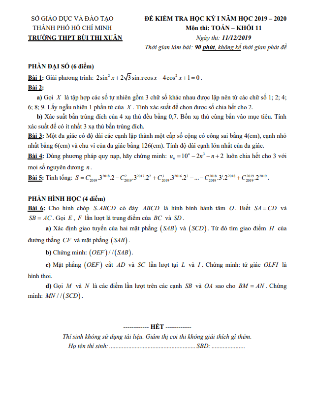 Đề Thi HK1 Toán 11 Đề thi học kì 1 Toán 11 năm 2019 – 2020 trường THPT Bùi Thị Xuân – TP HCM 15/01/2020