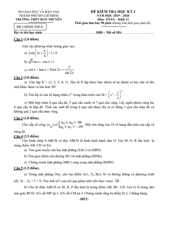 Đề Thi HK1 Toán 11 Đề thi học kì 1 Toán 11 năm 2019 – 2020 trường THPT Hàn Thuyên – TP HCM 15/01/2020