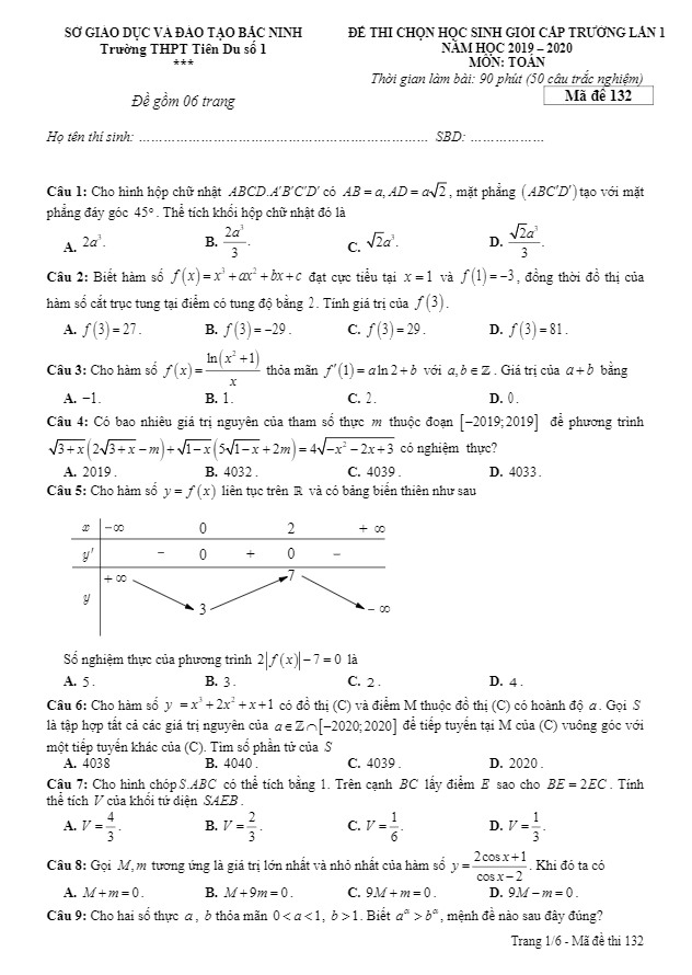 Đề Thi HSG Toán 12 Đề HSG Toán cấp trường lần 1 năm 2019 – 2020 trường Tiên Du 1 – Bắc Ninh 02/02/2020