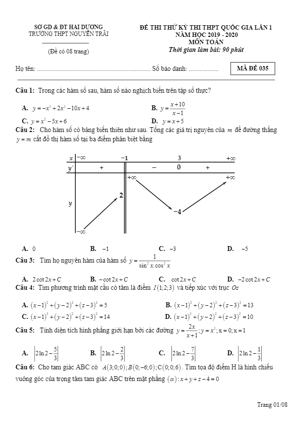 Đề Thi Thử THPT Môn Toán Đề thi thử Toán THPT QG 2020 lần 1 trường chuyên Nguyễn Trãi – Hải Dương 02/02/2020