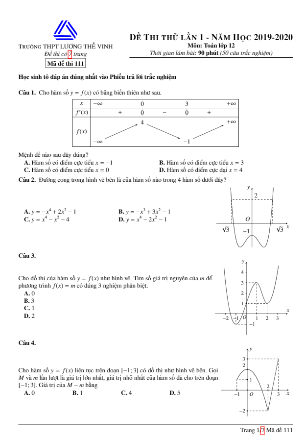 Đề Thi Thử THPT Môn Toán Đề thi thử Toán THPT Quốc gia 2020 lần 1 trường Lương Thế Vinh – Hà Nội 07/02/2020
