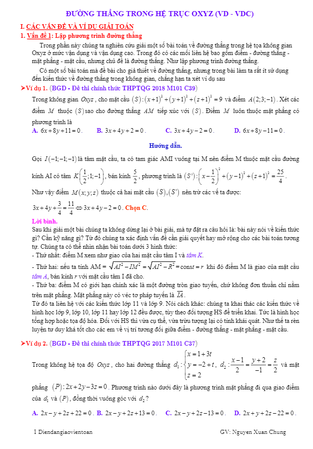 Phương Pháp Toạ Độ Trong Không Gian Đường thẳng trong hệ trục Oxyz (VD – VDC) – Nguyễn Xuân Chung 05/02/2020