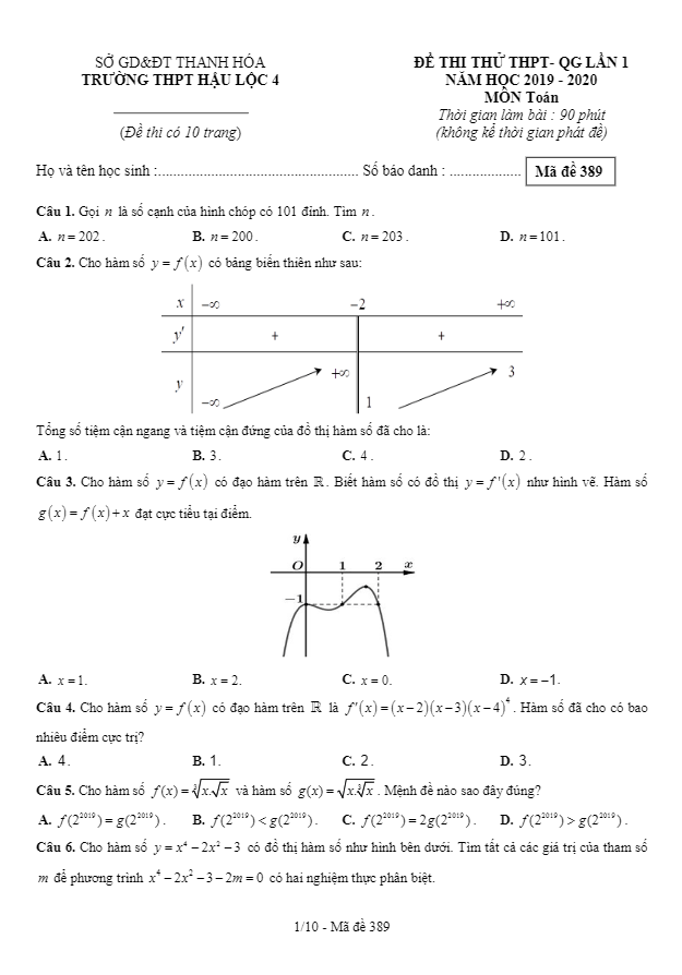 Đề Thi Thử THPT Môn Toán Đề thi thử Toán THPT QG 2020 lần 1 trường THPT Hậu Lộc 4 – Thanh Hóa 02/04/2020