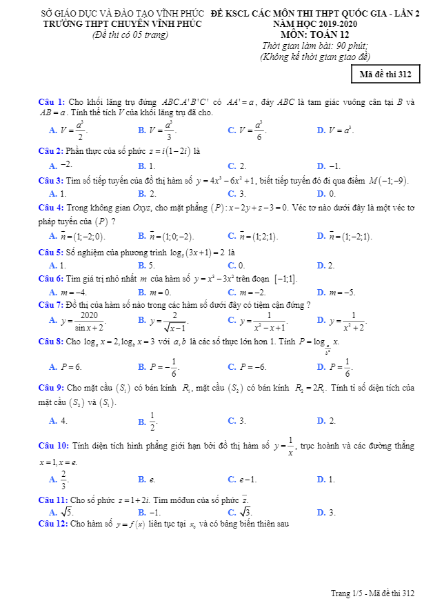Đề Thi Thử THPT Môn Toán Đề KSCL thi THPT Quốc gia 2020 môn Toán lần 2 trường THPT chuyên Vĩnh Phúc 24/05/2020