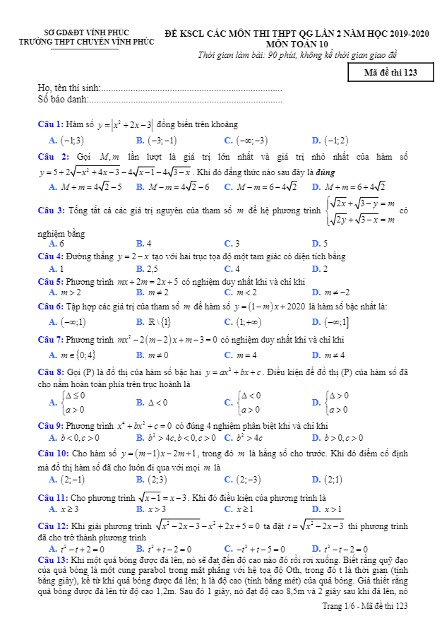 Khảo Sát Chất Lượng Toán 10 Đề KSCL Toán 10 thi THPT QG 2020 lần 2 trường THPT chuyên Vĩnh Phúc 25/05/2020