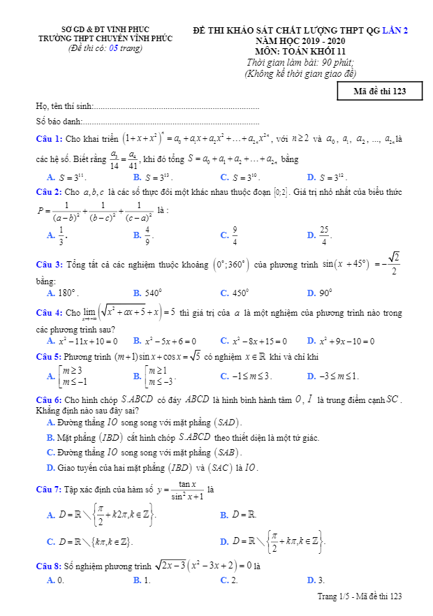 Khảo Sát Chất Lượng Toán 11 Đề KSCL Toán 11 thi THPT QG 2020 lần 2 trường THPT chuyên Vĩnh Phúc 25/05/2020
