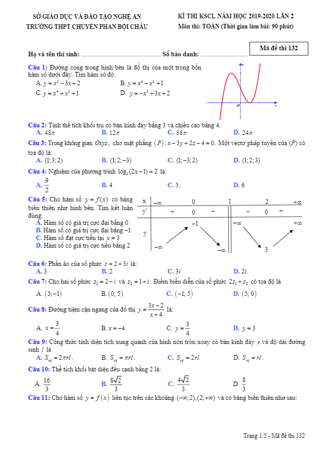 Đề Thi Thử THPT Môn Toán Đề KSCL Toán lần 2 năm 2019 – 2020 trường THPT chuyên Phan Bội Châu – Nghệ An 25/05/2020