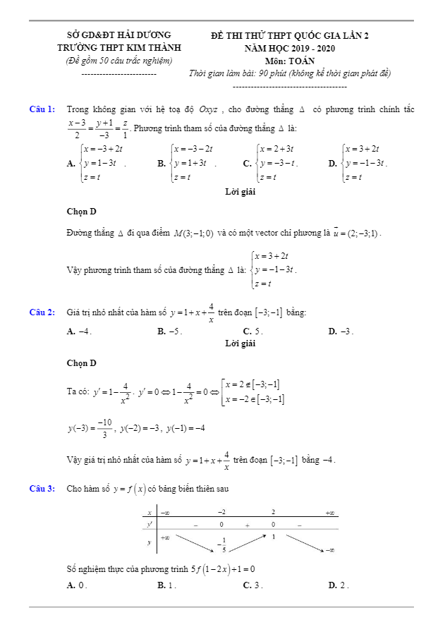 Đề Thi Thử THPT Môn Toán Đề thi thử THPTQG 2020 môn Toán lần 2 trường THPT Kim Thành – Hải Dương 25/05/2020