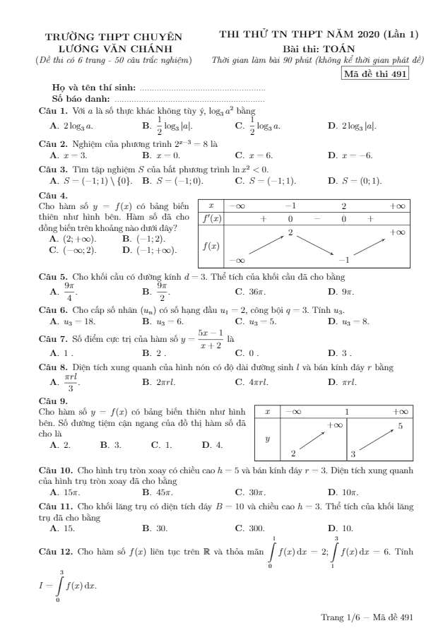 Đề Thi Thử THPT Môn Toán Đề thi thử TN THPT 2020 lần 1 môn Toán trường chuyên Lương Văn Chánh – Phú Yên 24/05/2020