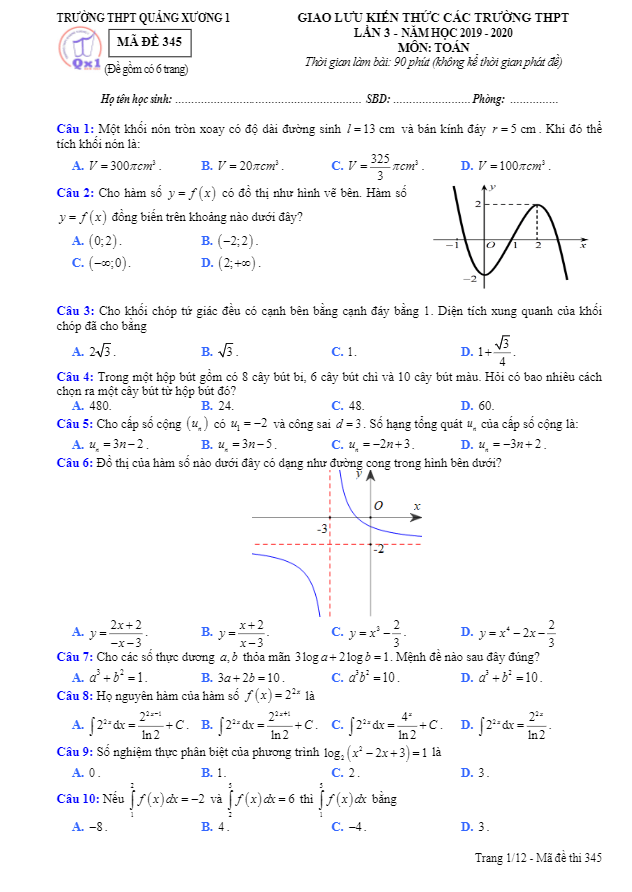 Đề Thi Thử THPT Môn Toán Đề giao lưu kiến thức Toán năm 2019 – 2020 lần 3 trường Quảng Xương 1 – Thanh Hóa 12/07/2020