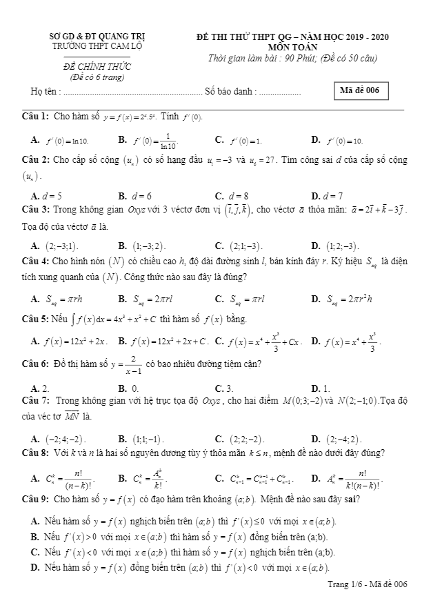 Đề Thi Thử THPT Môn Toán Đề thi thử THPT 2020 môn Toán lần 1 trường chuyên Nguyễn Quang Diêu – Đồng Tháp 14/07/2020