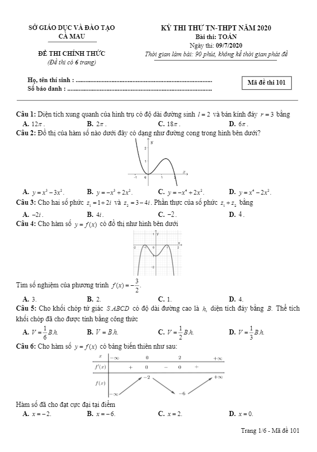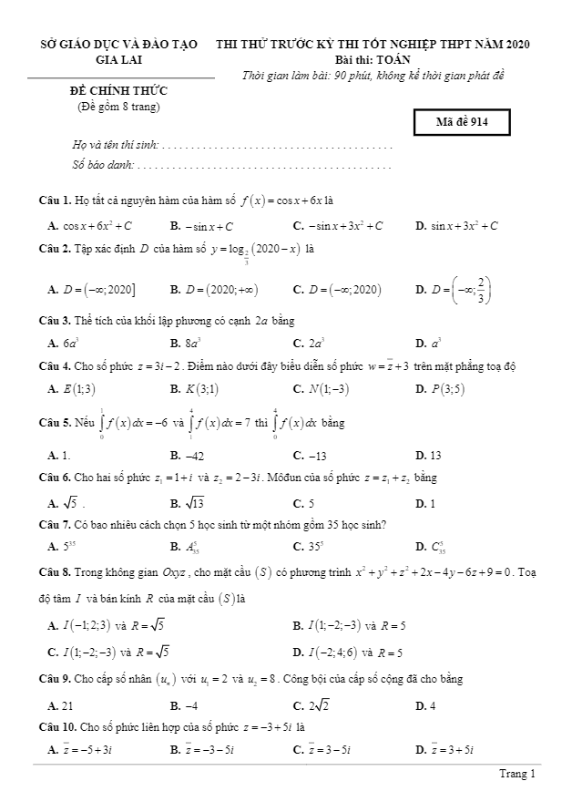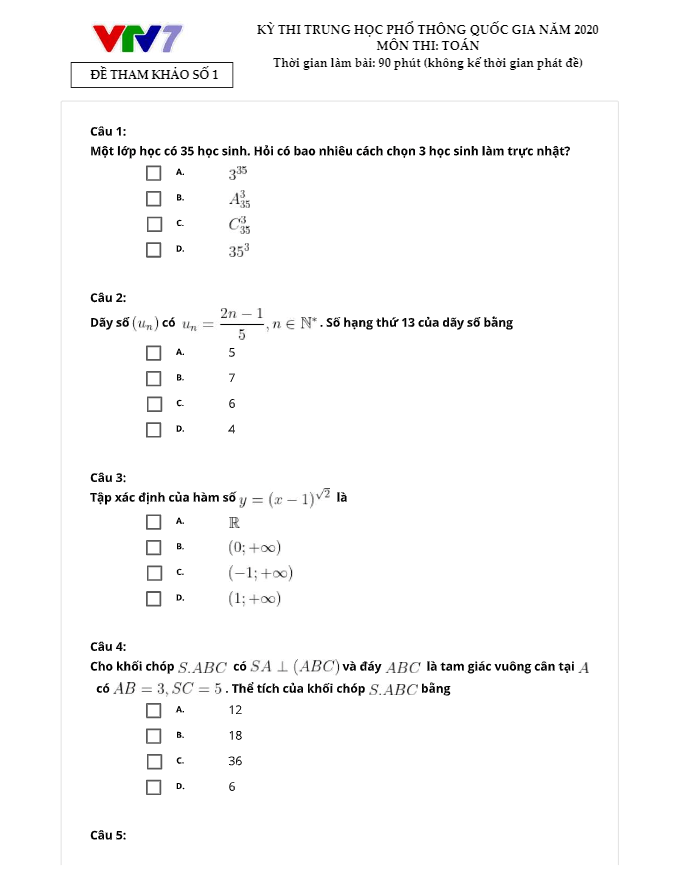 Đề Thi Thử THPT Môn Toán Đề thi thử TN THPT 2020 môn Toán kênh truyền hình Giáo dục Quốc gia VTV7 (Đề 1) 11/07/2020