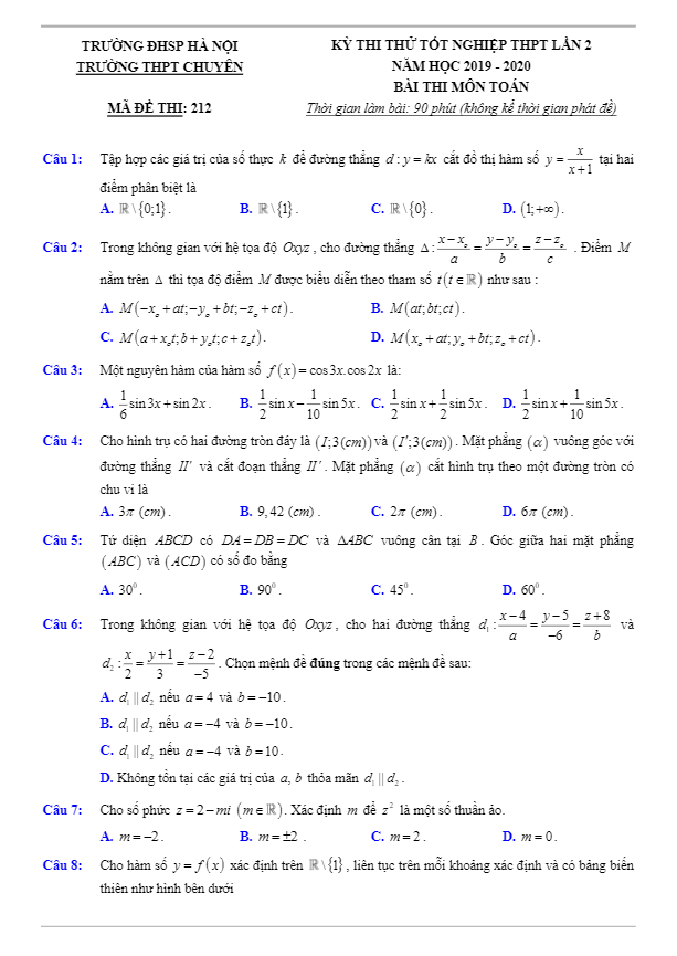Đề Thi Thử THPT Môn Toán Đề thi thử tốt nghiệp THPT 2020 môn Toán lần 2 trường THPT chuyên ĐHSP Hà Nội 12/07/2020
