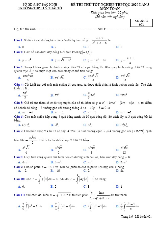 Đề Thi Thử THPT Môn Toán Đề thi thử tốt nghiệp THPT 2020 môn Toán lần 3 trường Lý Thái Tổ – Bắc Ninh 14/07/2020
