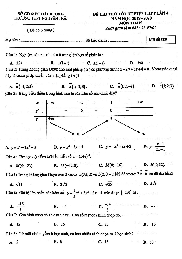 Đề Thi Thử THPT Môn Toán Đề thi thử tốt nghiệp THPT 2020 môn Toán lần 4 trường chuyên Nguyễn Trãi – Hải Dương 12/07/2020