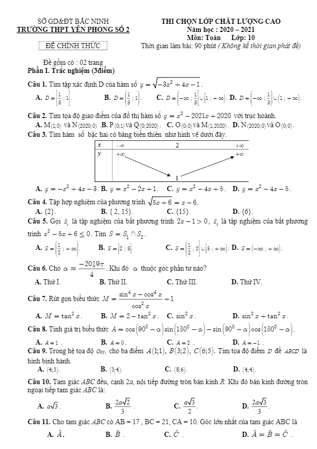 Khảo Sát Chất Lượng Toán 10 Đề chọn lớp chất lượng cao Toán 10 năm 2020 – 2021 trường Yên Phong 2 – Bắc Ninh 05/07/2020