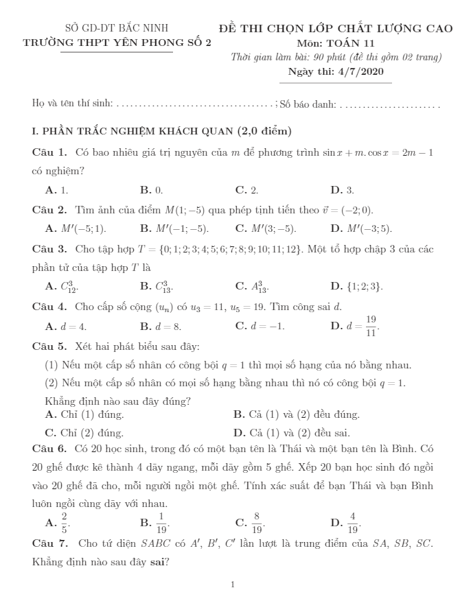 Khảo Sát Chất Lượng Toán 11 Đề chọn lớp chất lượng cao Toán 11 năm 2020 – 2021 trường Yên Phong 2 – Bắc Ninh 05/07/2020