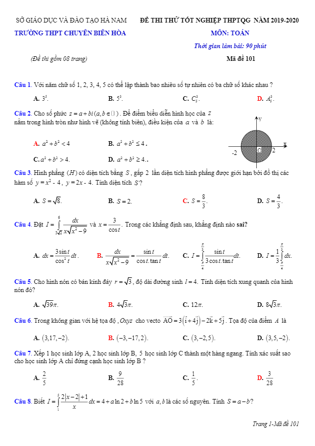 Đề Thi Thử THPT Môn Toán Đề thi thử tốt nghiệp THPT 2020 lần 2 môn Toán trường chuyên Biên Hòa – Hà Nam 04/07/2020