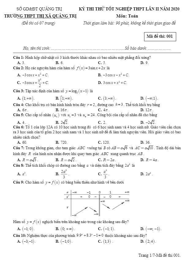Đề Thi Thử THPT Môn Toán Đề thi thử tốt nghiệp THPT 2020 môn Toán lần 2 trường THPT thị xã Quảng Trị 05/07/2020