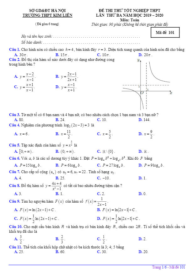 Đề Thi Thử THPT Môn Toán Đề thi thử tốt nghiệp THPT 2020 môn Toán lần 3 trường THPT Kim Liên – Hà Nội 05/07/2020