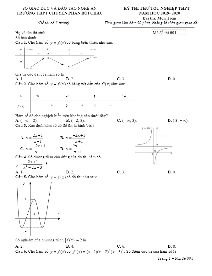 Đề Thi Thử THPT Môn Toán Đề thi thử tốt nghiệp THPT 2020 môn Toán trường chuyên Phan Bội Châu – Nghệ An 05/07/2020