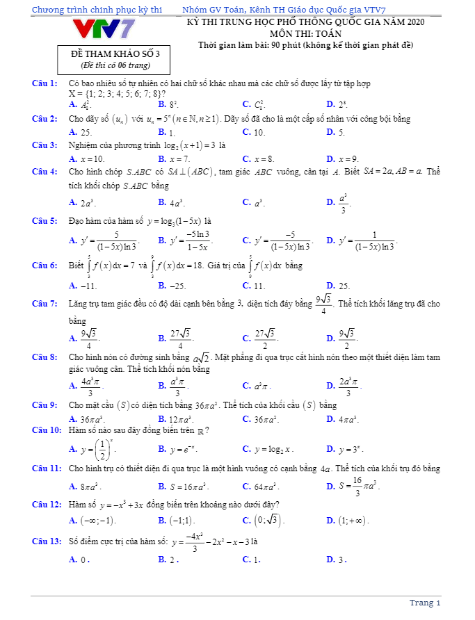 Đề Thi Thử THPT Môn Toán Đề thi thử TN THPT 2020 môn Toán kênh truyền hình Giáo dục Quốc gia VTV7 (Đề 3) 07/08/2020