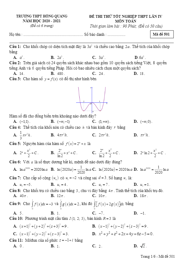 Đề Thi Thử THPT Môn Toán Đề thi thử tốt nghiệp THPT 2020 môn Toán lần 4 trường THPT Hồng Quang – Hải Dương 03/08/2020
